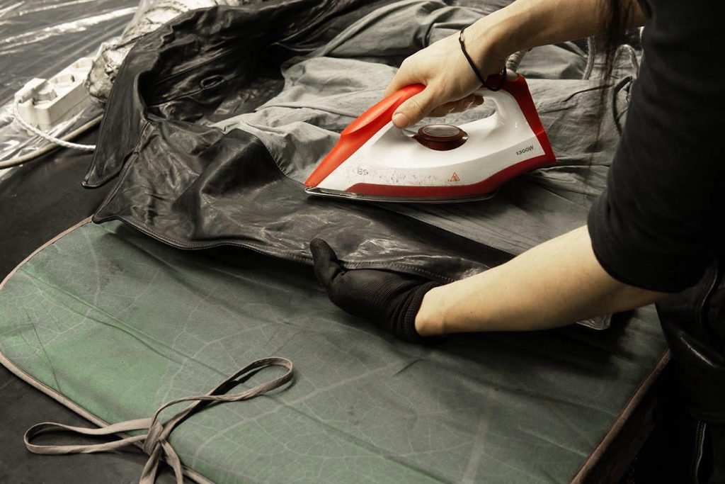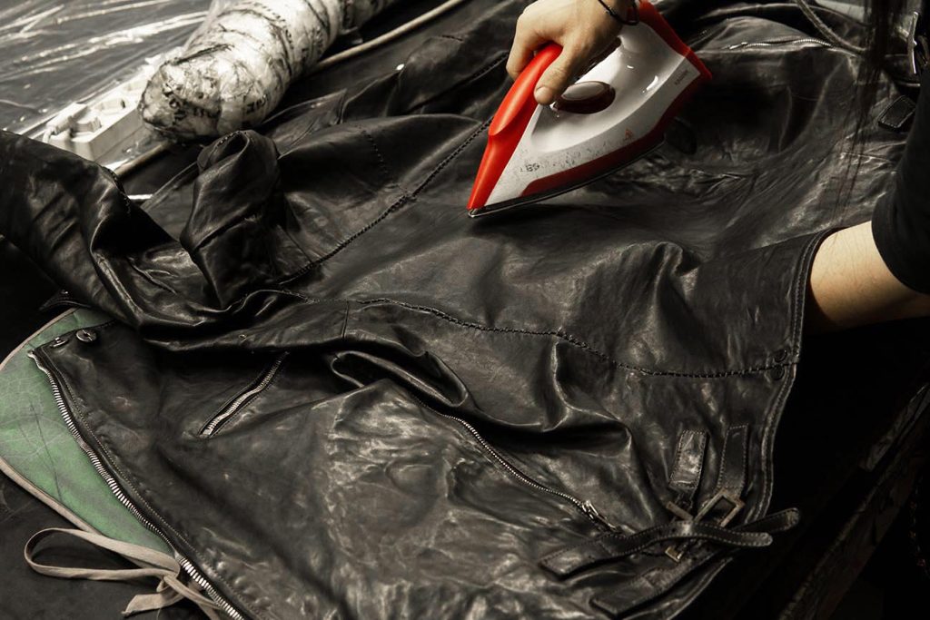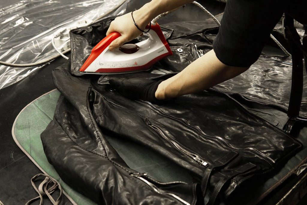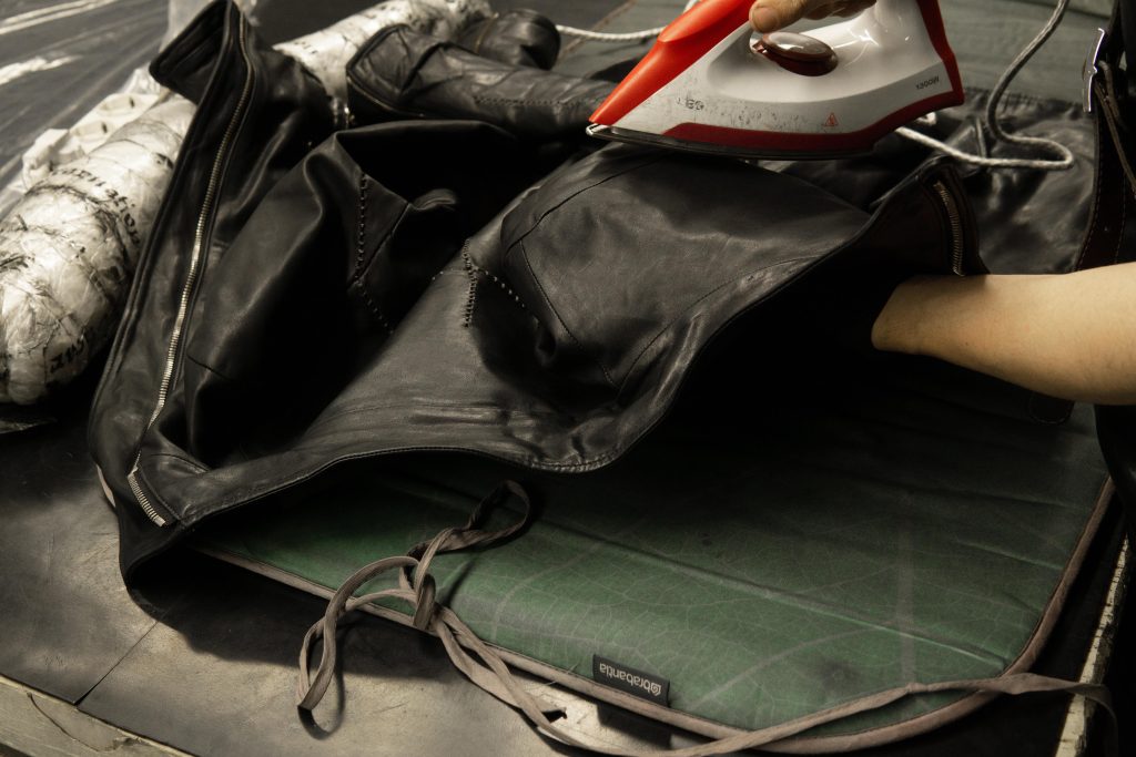 特にレザーウェアの立体的な部分は、そのままアイロンを押し当てると均等に熱が入らないため、下から手の平を当てることで、手の平をクッションがわりにすると変なシワや跡が無く、思い描く立体感に仕上がります。