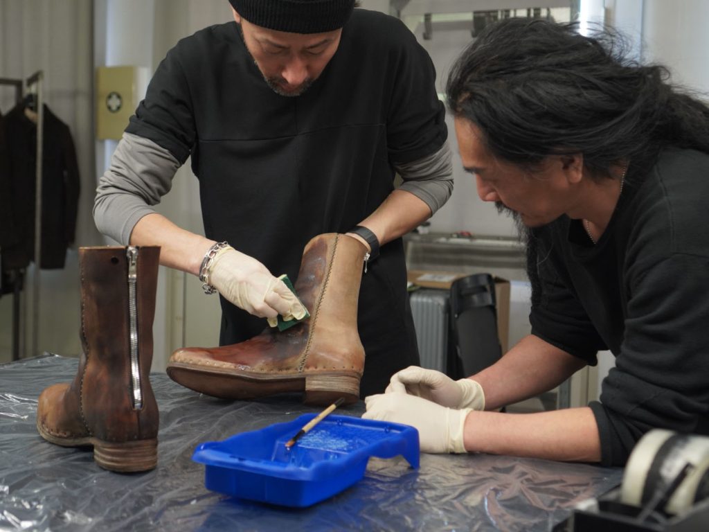 弊社ラボラトリーにて レザーウェアのオイルケア&色補正、ブーツのオイルケア