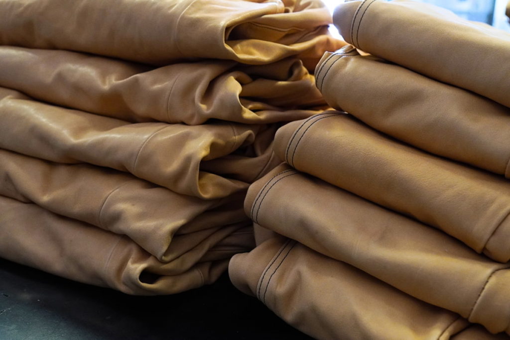 革の表情が最も美しく見えるポイントを優先するため、パターンよりも革の取り都合を重視し、一点ずつ、相談を重ねながら裁断と配置を決めていく