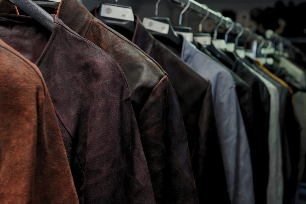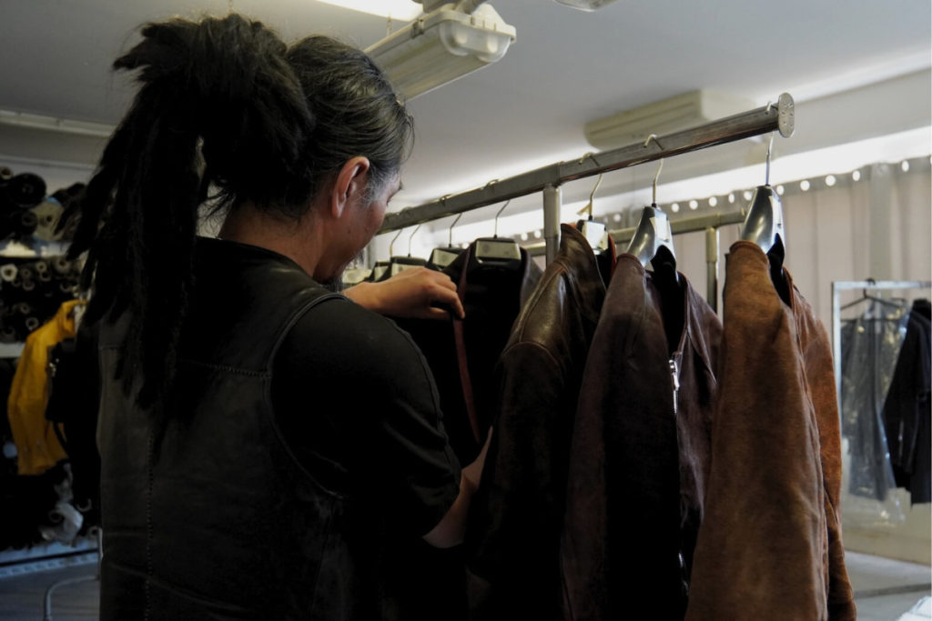 アトリエの中では、秋冬のオーダーウェアと、春夏の加工前サンプル、乾きかけのレザーが共存し、空間が季節を跨いでいます。