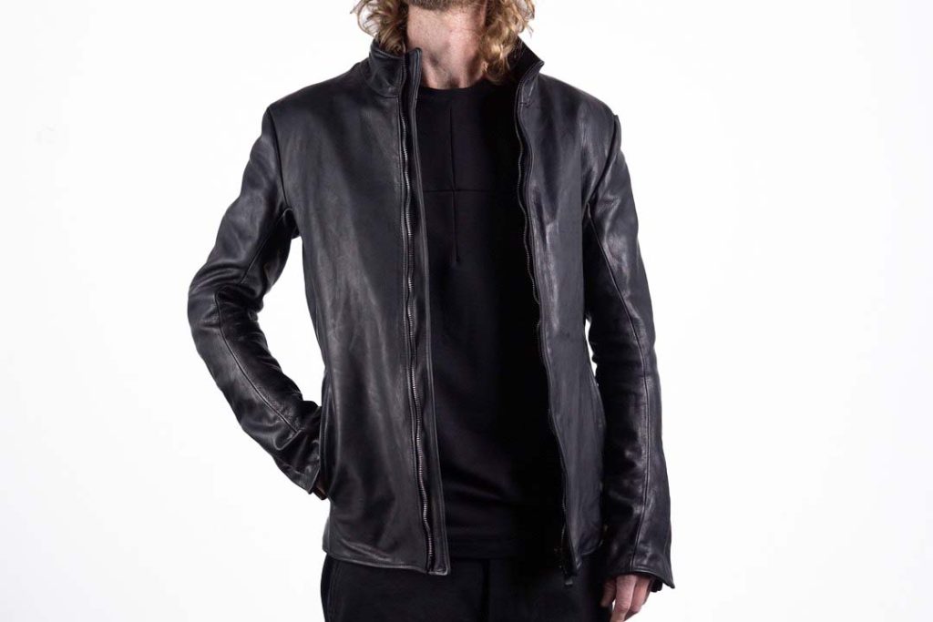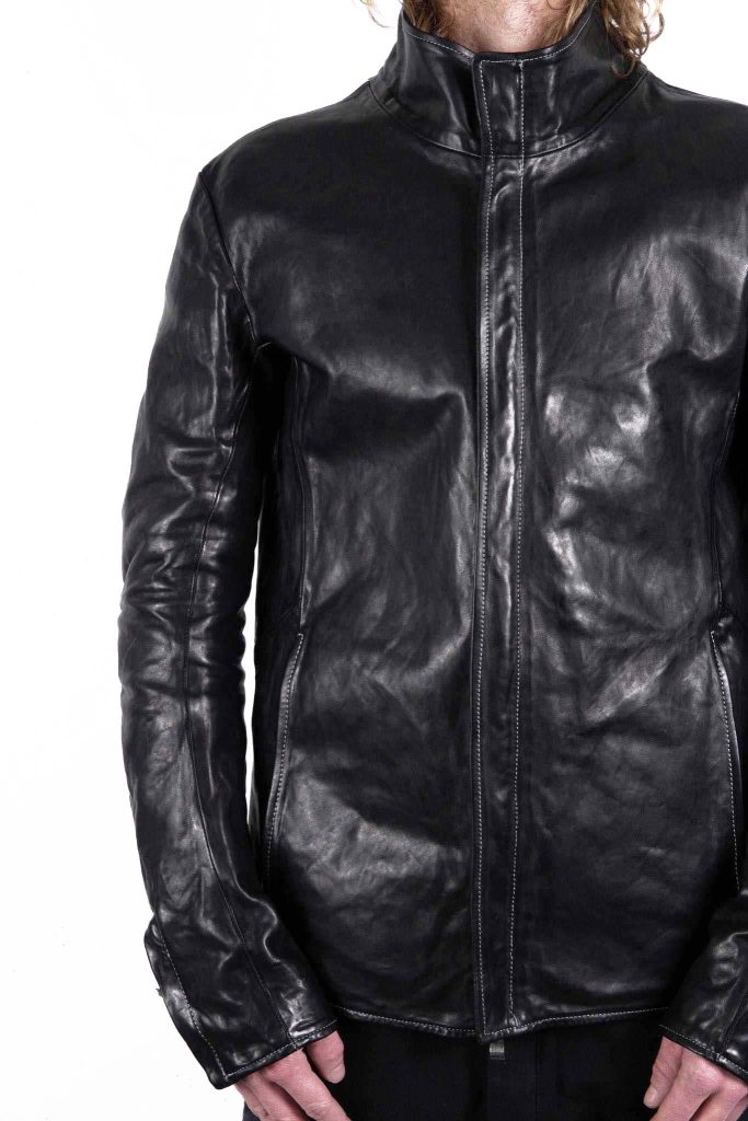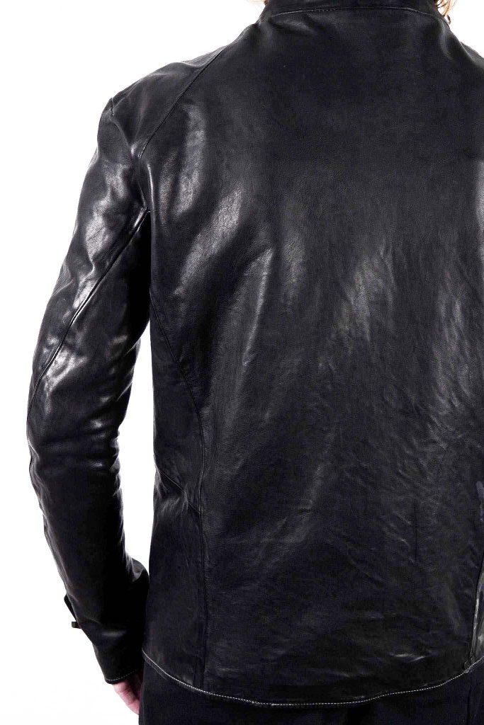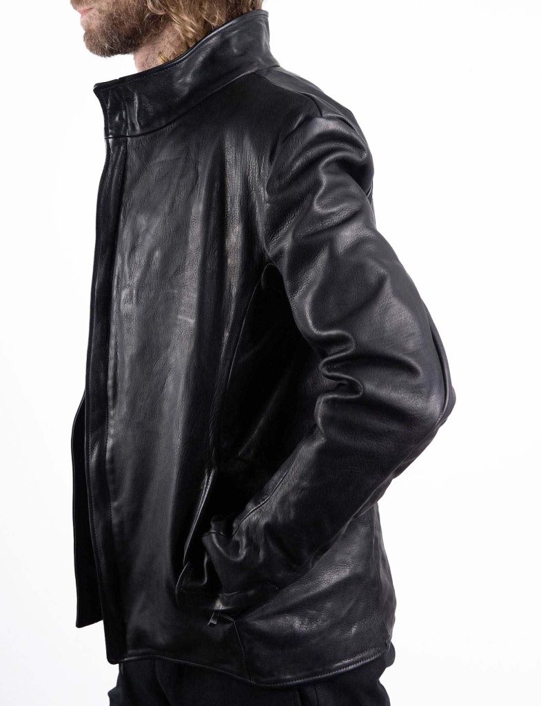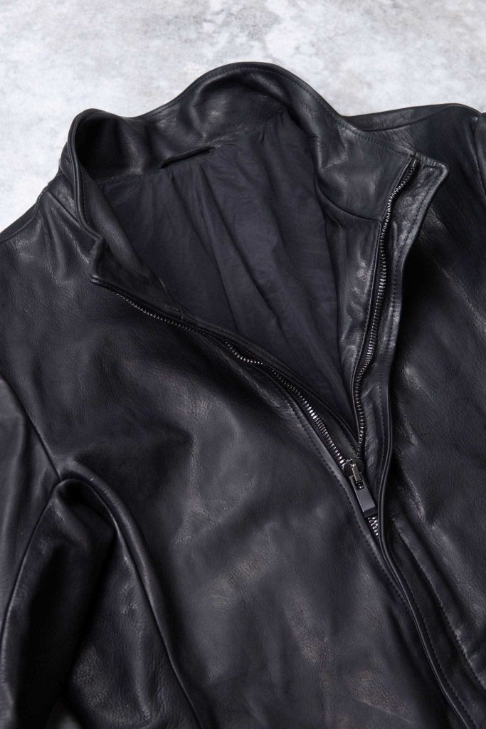 首元を包み込むように立ち上がるハイカラーは、着用するだけで凛とした印象をつくり出します。深いブラックの中でわずかに光が拾われ、革の奥行きと造形の美しさ が際立ちます。