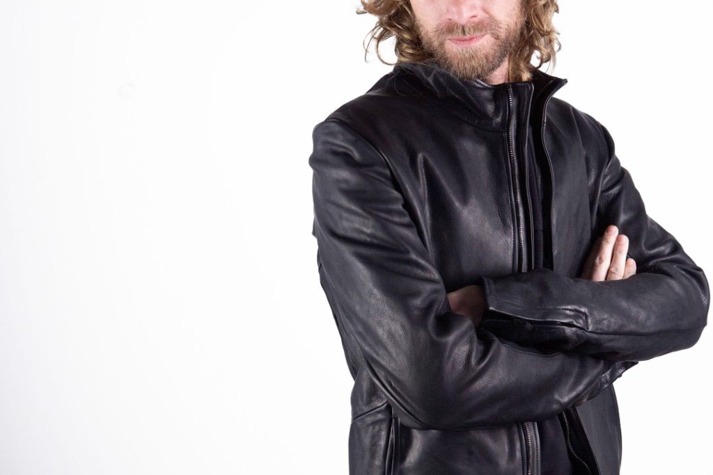 肩から袖にかけて革がしなやかに落ち、動いた瞬間に 一瞬だけ光が走る。