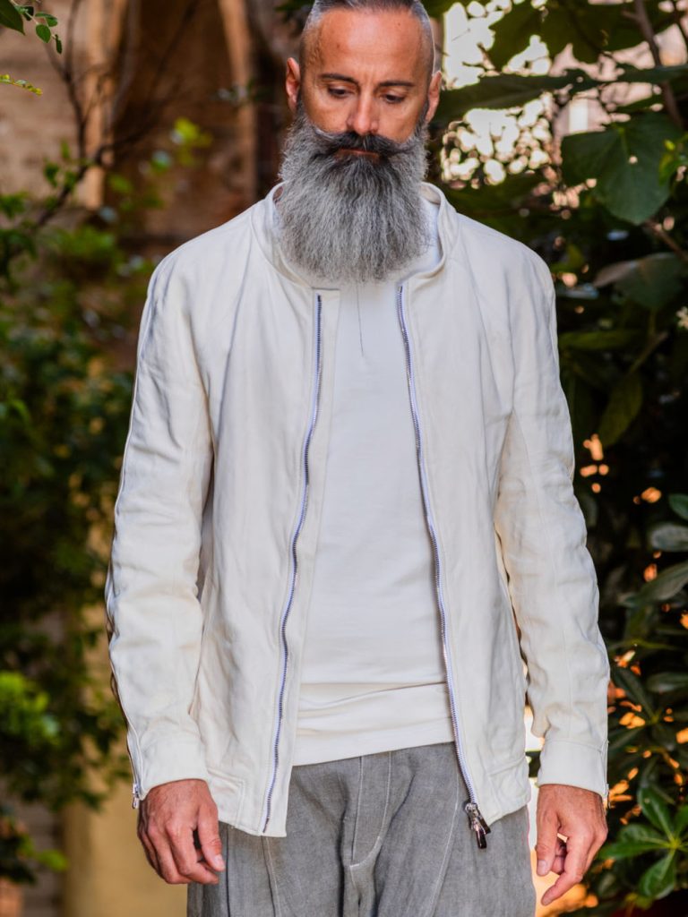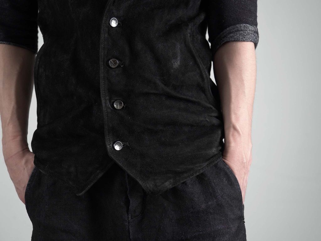 スムースレザーとは異なるスウェードならではの表情、そして「ベスト」というアイテムだからこそ生まれるレイヤードの可能性にも注目しました。