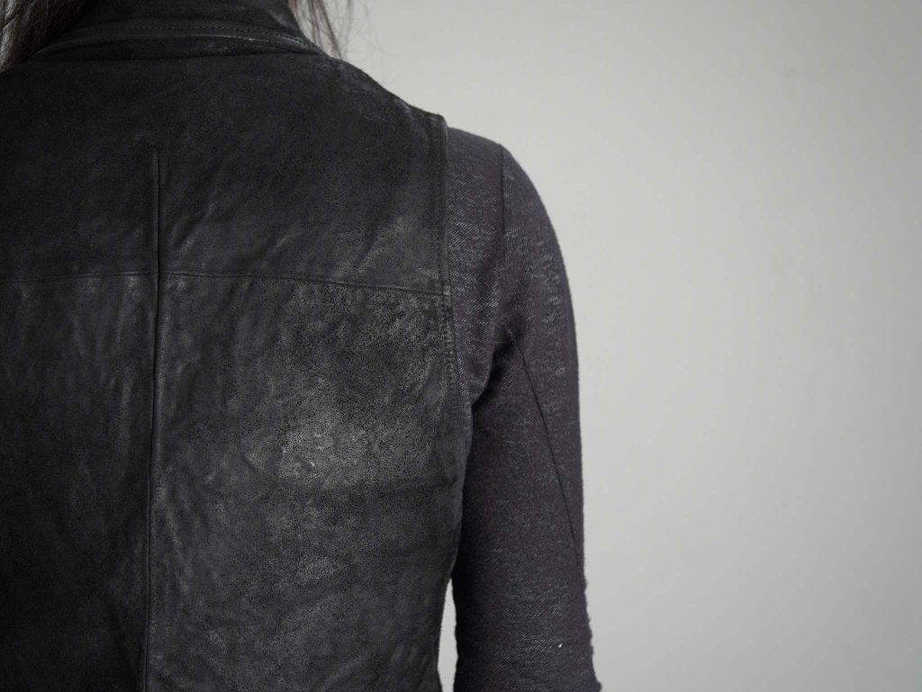 このシープレザーベストは、一枚で着たときに成立するデザインバランスを持ちながらもコートやレザージャケットの下にレイヤードすることを想定して作られたモデルです。