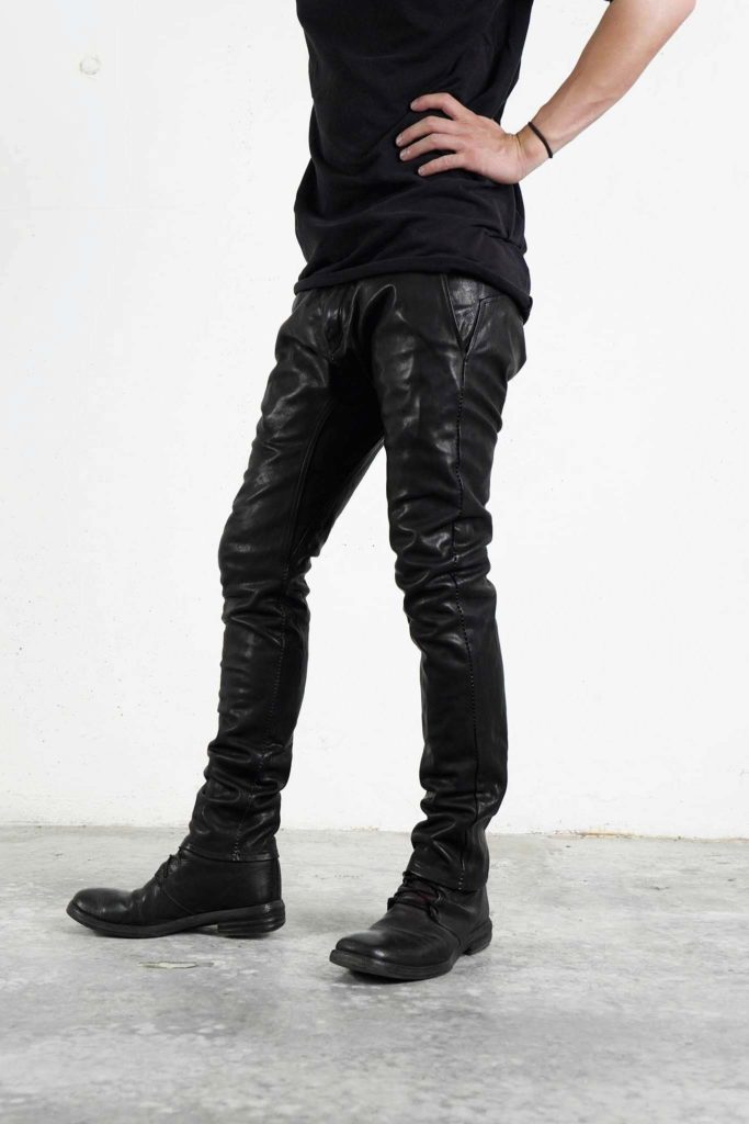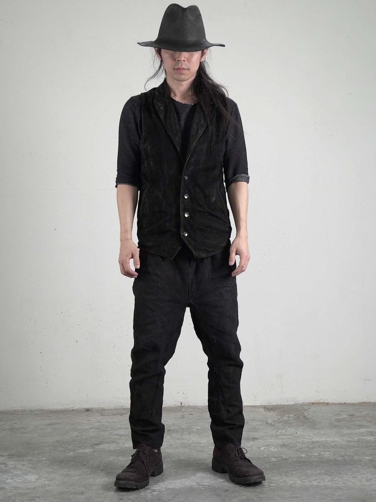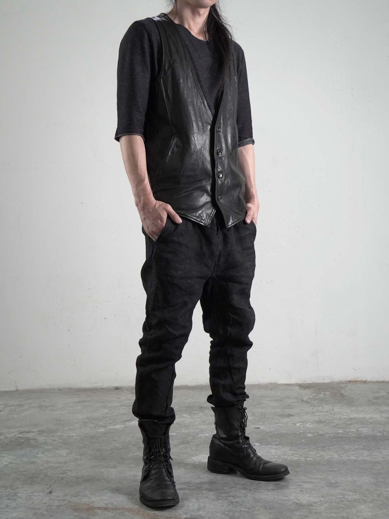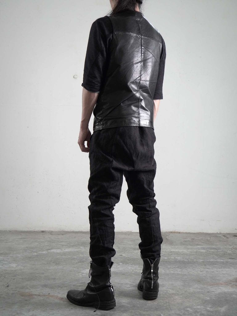 一見すると男らしさ感じさせるデニムとエンジニアブーツの組み合わせに対して、このベストは線が細く、縦のラインを強調する構造。