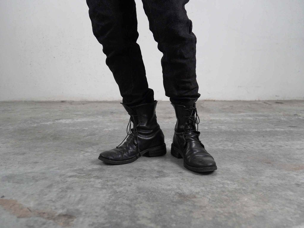 このスタイリングでは、あえてブーツを裾で隠すように着用しています。