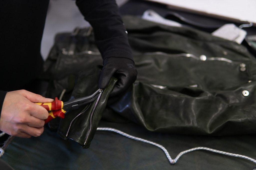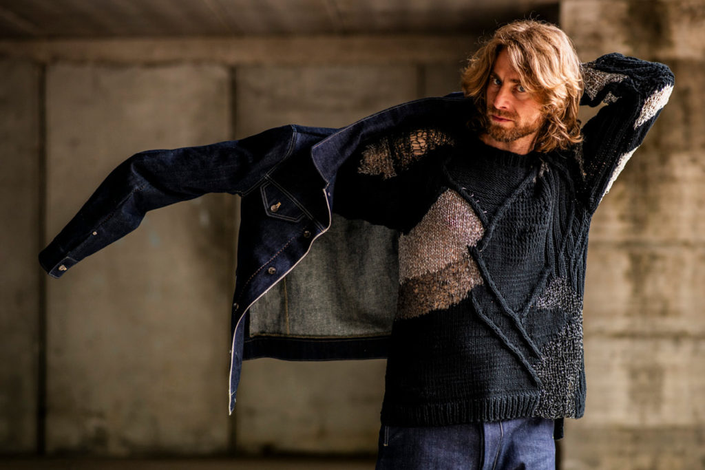 完成された状態から始まるのではなく、着ることで素材がほどけていく。
