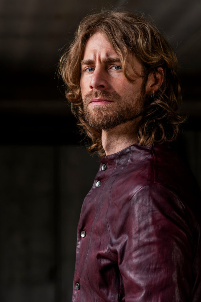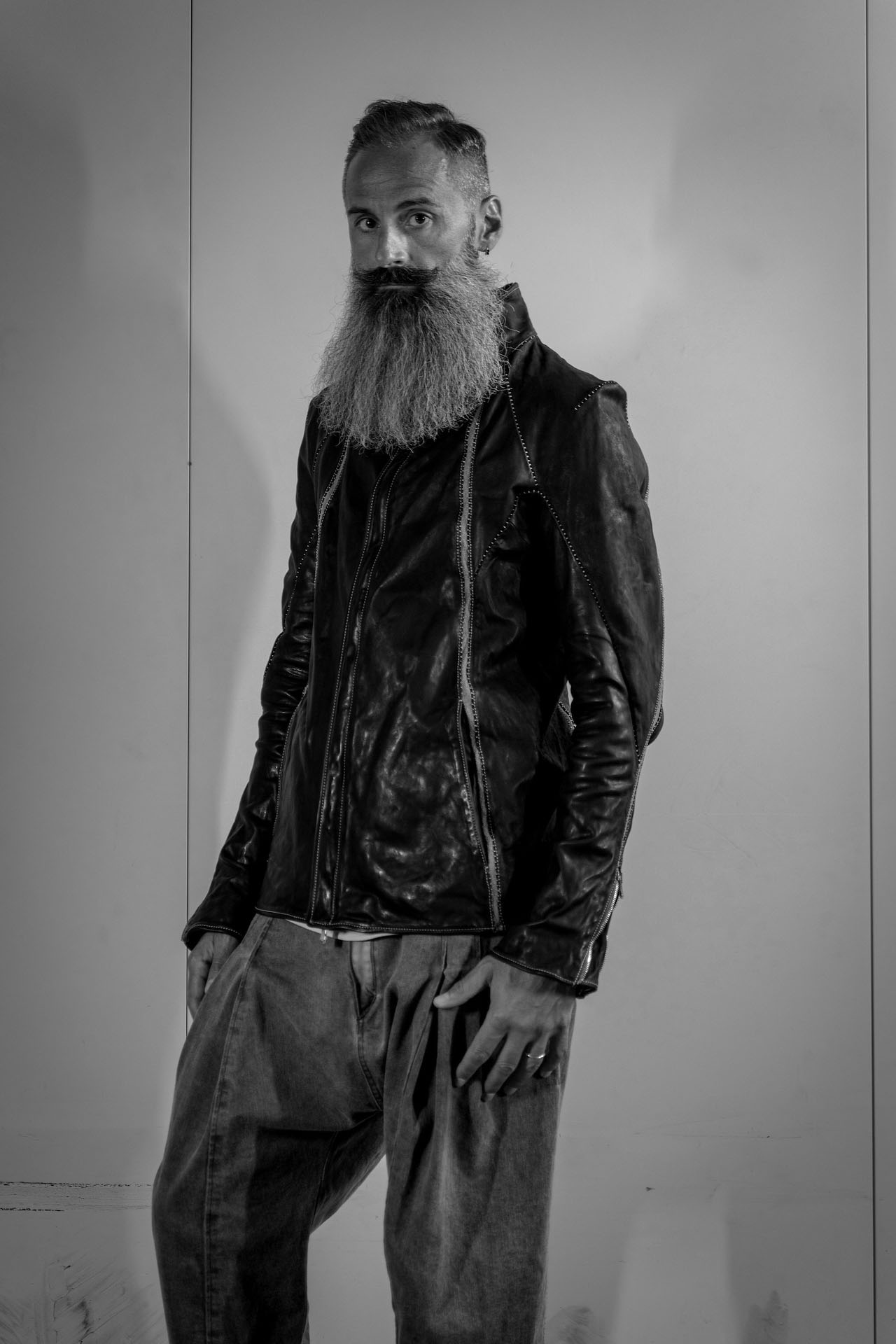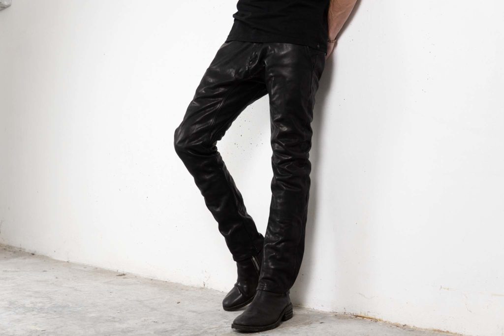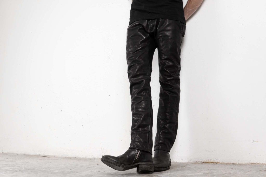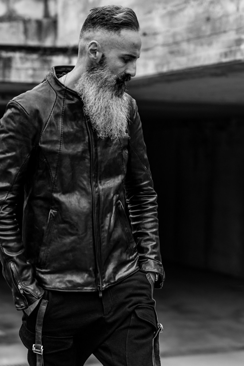 足元はデニムとエンジニアブーツで、しっかりと男らしくまとめていますが、このスタイリングが単なる無骨に終わらないのは、合わせているシープレザーベストが持つ、モードな空気感があるからこそです。