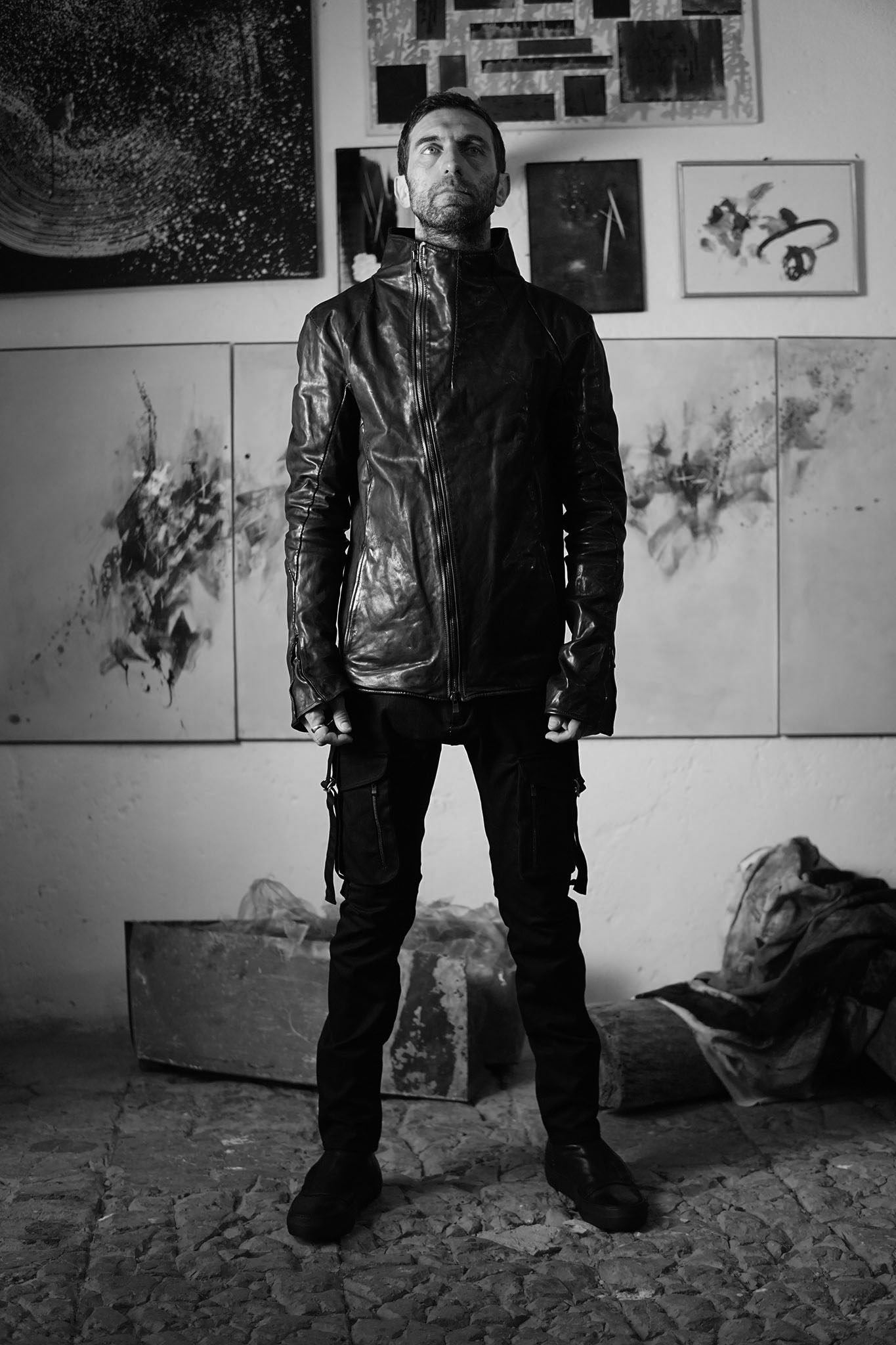 男らしい要素が強い足元に対して、ベストが持つモードな雰囲気が中和剤となり、